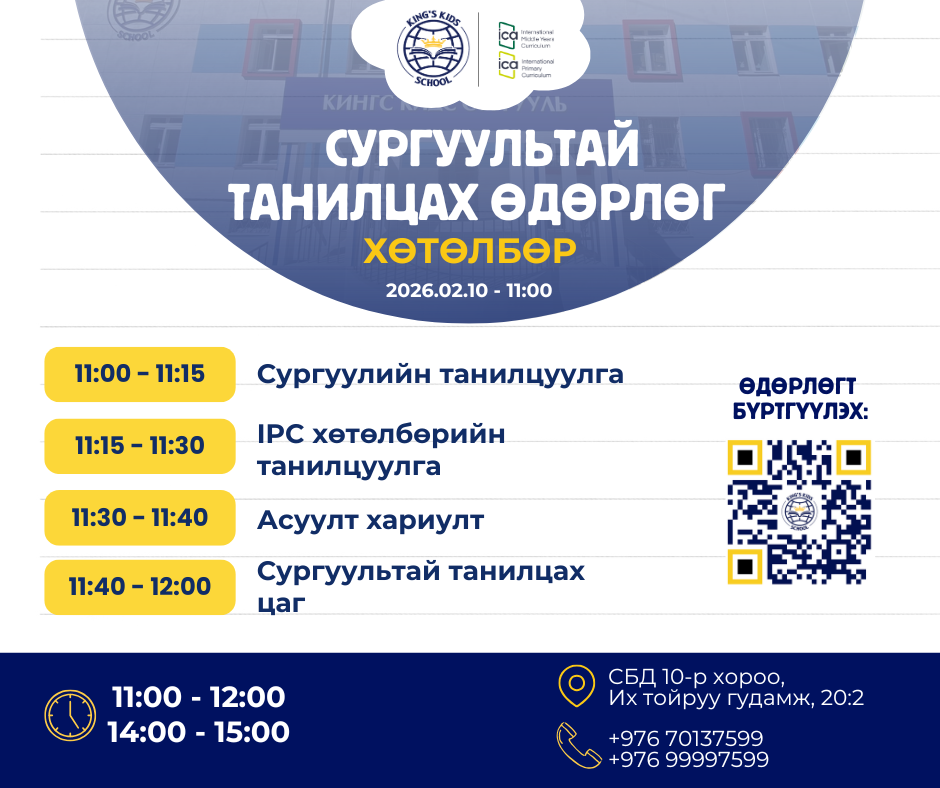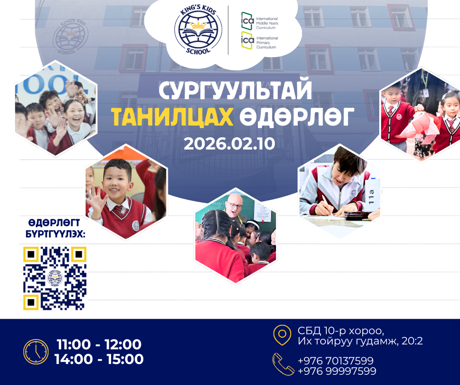 Кингс Кидс сургууль нь 2026–2027 оны хичээлийн жилд 1-р ангид шинээр элсэх сурагчдын эцэг эх, асран хамгаалагчдад зориулсан “Сургуультай танилцах өдөрлөг”-ийг зохион байгуулах гэж байна. Манай сургуульд хүүхдээ элсүүлэхээр сонирхож буй та бүхнийг хүрэлцэн ирж, сургуулийн орчинтой танилцах, сургалтын хөтөлбөр, үйл ажиллагааны талаар дэлгэрэнгүй мэдээлэл авахыг урьж байна.Хугацаа: